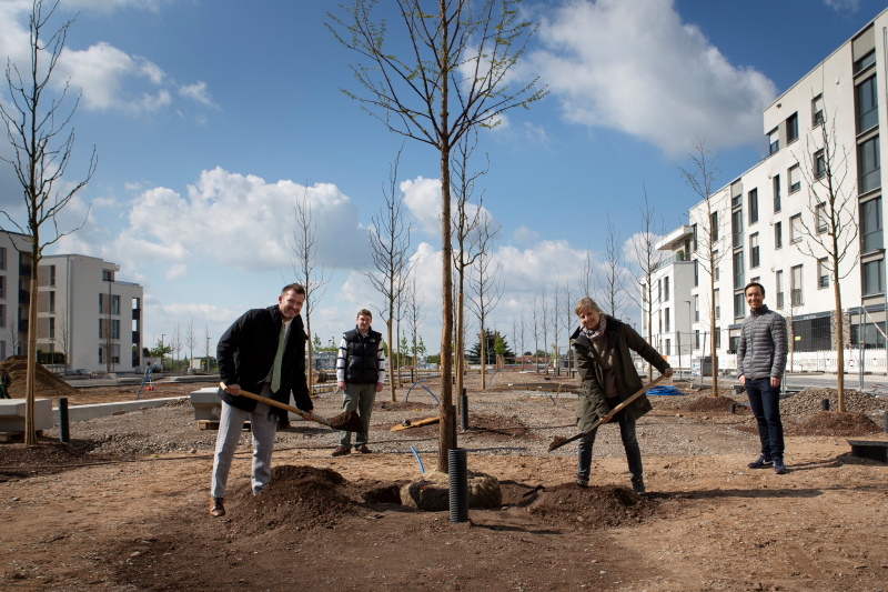 An der Pfaffengrunder Terrasse in der Bahnstadt entsteht zwischen Promenade und Gadamerplatz ein neuer Platz mit zahlreichen Angeboten zur Naherholung und Bewegung sowie mit viel Grün. Derzeit werden dort 125 Bäume gepflanzt. In einem der nächsten Schritte wird eine 2.200 Quadratmeter große Rasenfläche angelegt. Die Eröffnung ist im Laufe der Sommerferien geplant.