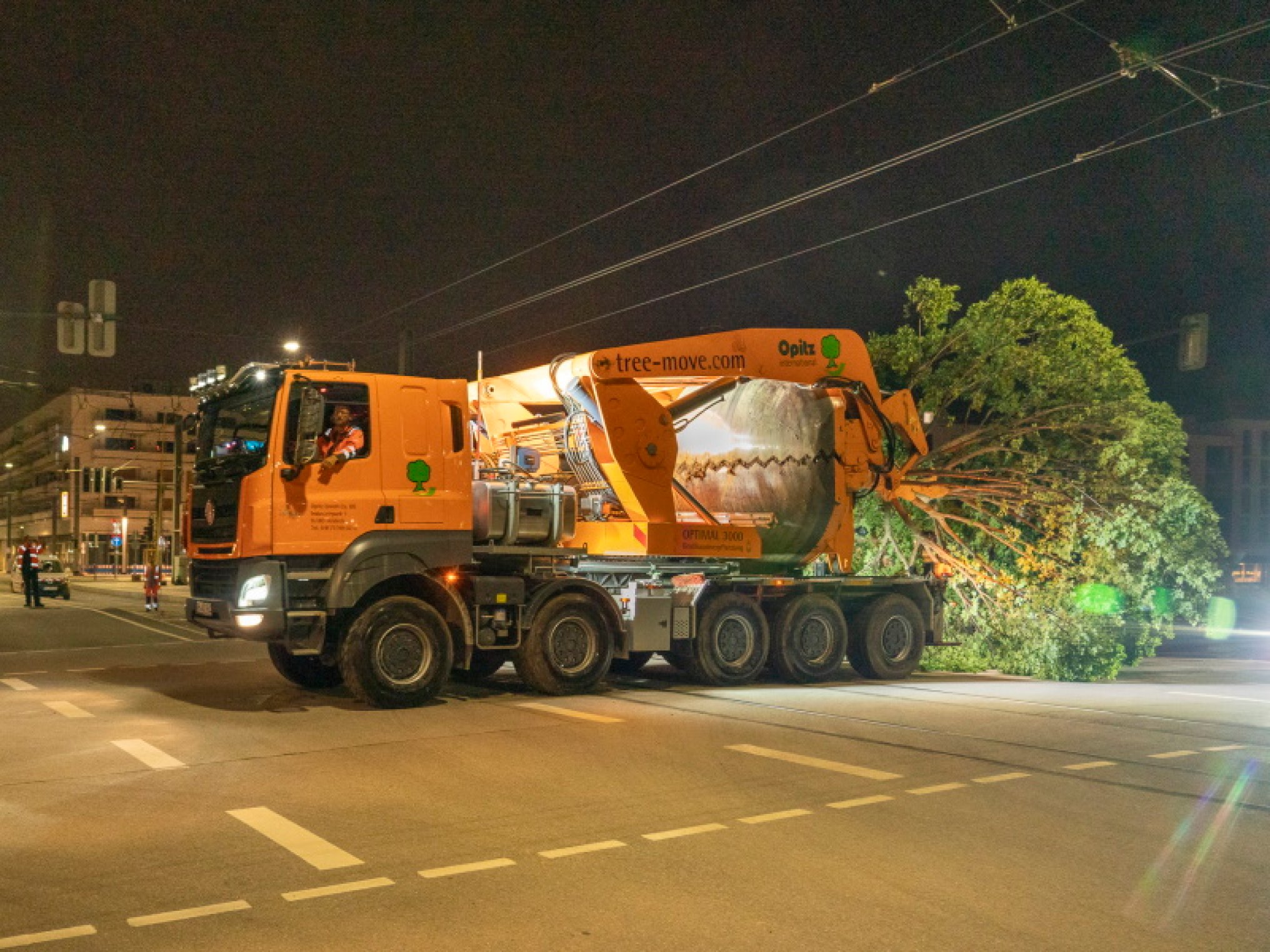 Bereits am Mittag hatte eine Spezialfirma begonnen, die Bäume fachgerecht zu beschneiden, um sie für den Transport vorzubereiten. Um die Bäume sorgfältig zu verpflanzen, kam eine der größten hydraulische Spatenmaschine Deutschlands zum Einsatz. Diese umstach am Nachmittag den etwa drei Meter breiten Wurzelballen des ersten Baumes mit hydraulisch angetriebenen Spatenblättern und hob diesen aus dem Erdboden auf den Spezial-Laster.
