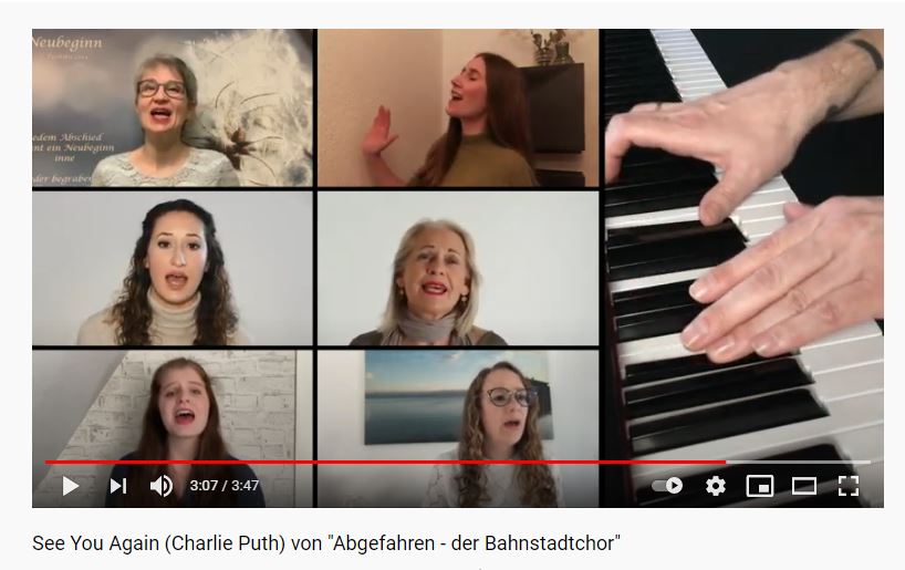 Chorleiter Timo Töngi erzählt: „Es war so schade, dass wir aufgrund der Situation keine Auftritte mehr geben konnten. Deswegen kam ich auf die Idee, einen Zusammenschnitt auf Youtube zu stellen. Das Lied war auch schnell gefunden, ‚See you again‘ von Charlie Puth, weil es einfach zur Situation passt. 36 Sängerinnen und Sänger wollten am Projekt teilnehmen und haben sich dann mit ihrem Smartphone zu Hause beim Singen aufgenommen. Es hat mich über 100 Stunden Arbeit gekostet, um alles zusammenzuschneiden, aber ich finde, das Ergebnis kann sich sehen lassen. Wir müssen uns nicht hinter anderen Chorvideos verstecken.“