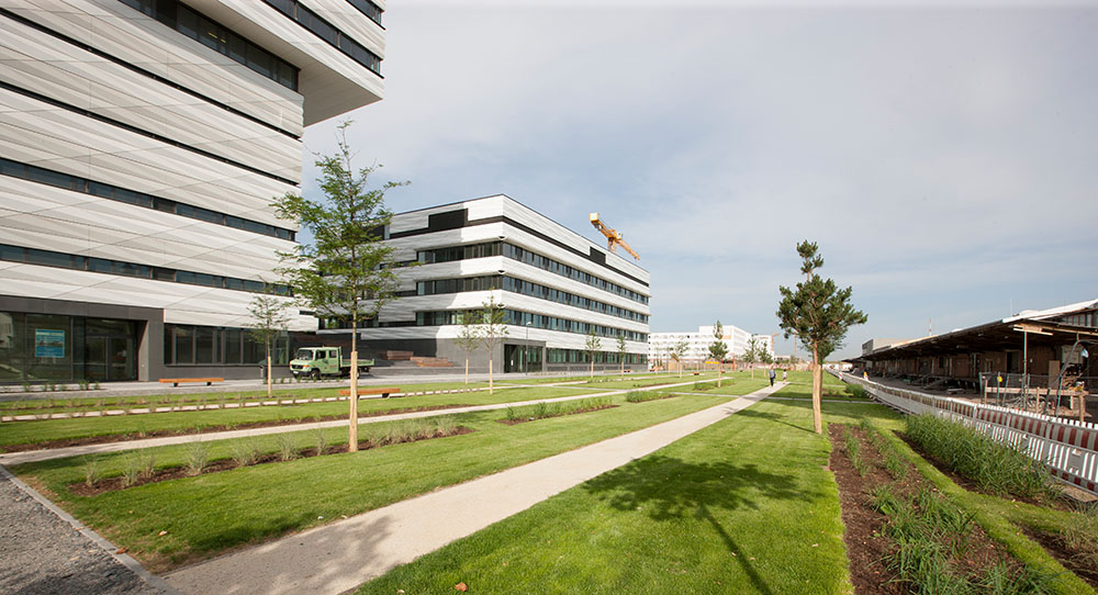 Der Zollhofgarten ist der grüne Erholungsraum in der Bahnstadt, so groß wie etwa eineinhalb Fußballfelder. Mit der Pfaffengrunder Terrasse ist der Zollhofgarten der Freiraum mit den meisten Bäumen in der Bahnstadt. 120 Bäume wachsen hier in die Höhe: Der Dornenlose Lederhülsenbaum, die Waldkiefer und Vogelkirsche, die innerhalb der vergangenen zehn Jahren eine Höhe von rund acht Metern erreicht haben.