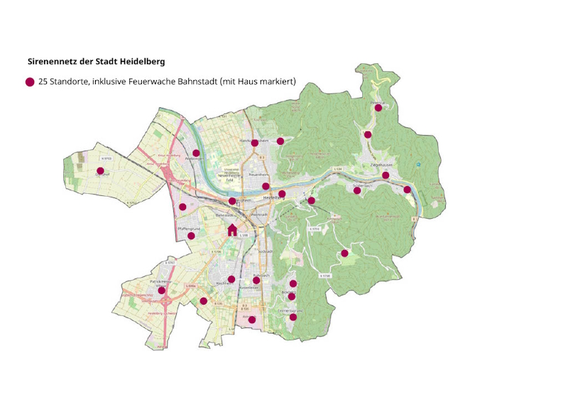 Das Sirenennetz erweitert die bereits bestehenden Warnmöglichkeiten der Stadt Heidelberg. Im Notfall erhalten Bürgerinnen und Bürger Warnungen unter anderem über die kostenlosen Warn-Apps NINA und Katwarn, etwa amtliche Warnungen der Stadt Heidelberg und anderer Behörden in Katastrophenfällen, wie bei Großbränden, Gefahrstoffausbreitungen und Hochwasser in Heidelberg. Zugleich erfahren Nutzer über die NINA-App, wie sie sich in der jeweiligen Situation am besten verhalten sollen. Stadt und Feuerwehr Heidelberg empfehlen Bürgerinnen und Bürgern daher dringend, sich insbesondere die NINA-App in einem der gängigen App-Stores kostenlos herunterzuladen.