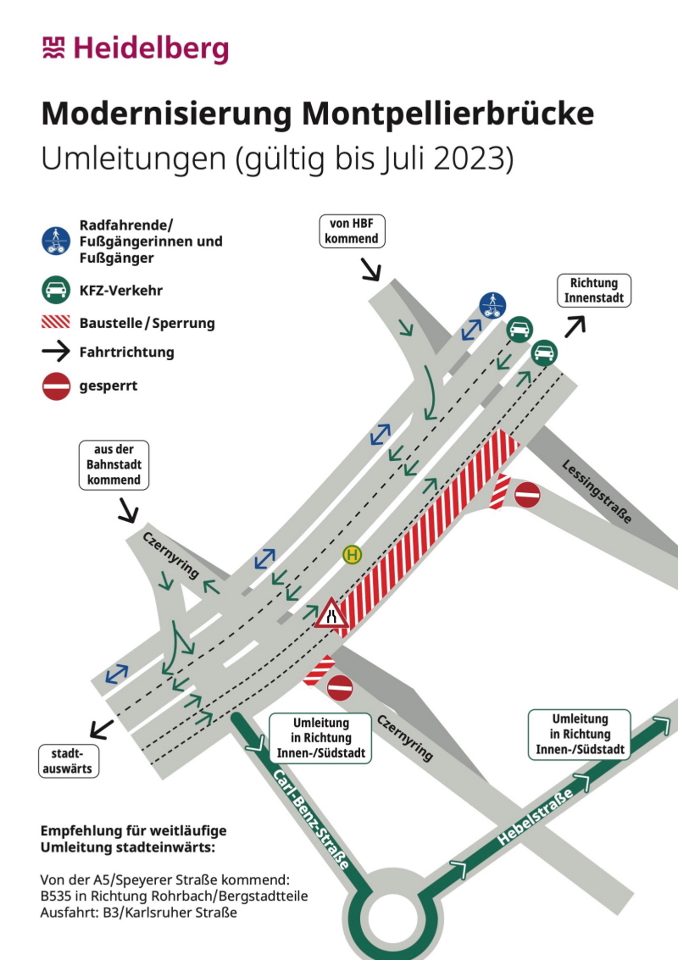 - Von der A5/Speyerer Straße in Richtung Innenstadt und südliche Stadtteile wird eine weitläufige Umleitung über die B535 in Richtung Rohrbach/Bergstadtteile -> Ausfahrt: B3/Karlsruher Straße empfohlen.