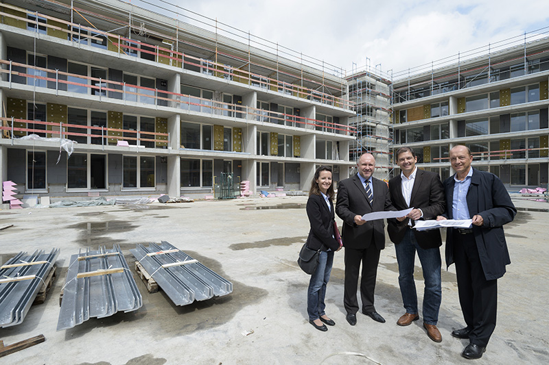 Erster Bürgermeister und Baudezernent Bernd Stadel informierte sich am Dienstag, 18. August 2015, bei einer Baustellenbegehung über den Baufortschritt: „Die Arbeiten im zweiten Wohnbauabschnitt westlich der Pfaffengrunder Terrasse laufen auf Hochtouren. Das ist auch gut so: Aktuell leben bereits rund 2.400 Menschen in der Bahnstadt, das Angebot hier entlastet den gesamten Heidelberger Wohnungsmarkt. Mit dem Carré Clair kommen weitere 96 Wohnungen dazu.“