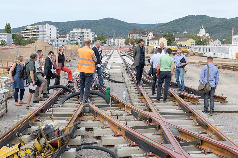 Die Mobilitätsnetz-Projekte in der Bahnstadt und im Pfaffengrund schreiten zügig voran. Im Juli 2016 haben die Arbeiten für die neue Bahnstadt-Straßenbahn im Bereich Grüne Meile begonnen, seit Anfang 2017 wird die Trasse in der Eppelheimer Straße umgebaut. Beide Maßnahmen liegen gut im Zeitplan: Die Inbetriebnahme der Gleisstrecke im Pfaffengrund, durch die Grüne Meile und zur Czernybrücke ist für Ende 2017 geplant. Erster Bürgermeister Jürgen Odszuck informierte sich am Donnerstag, 24. August 2017, vor Ort über den Baufortschritt.
