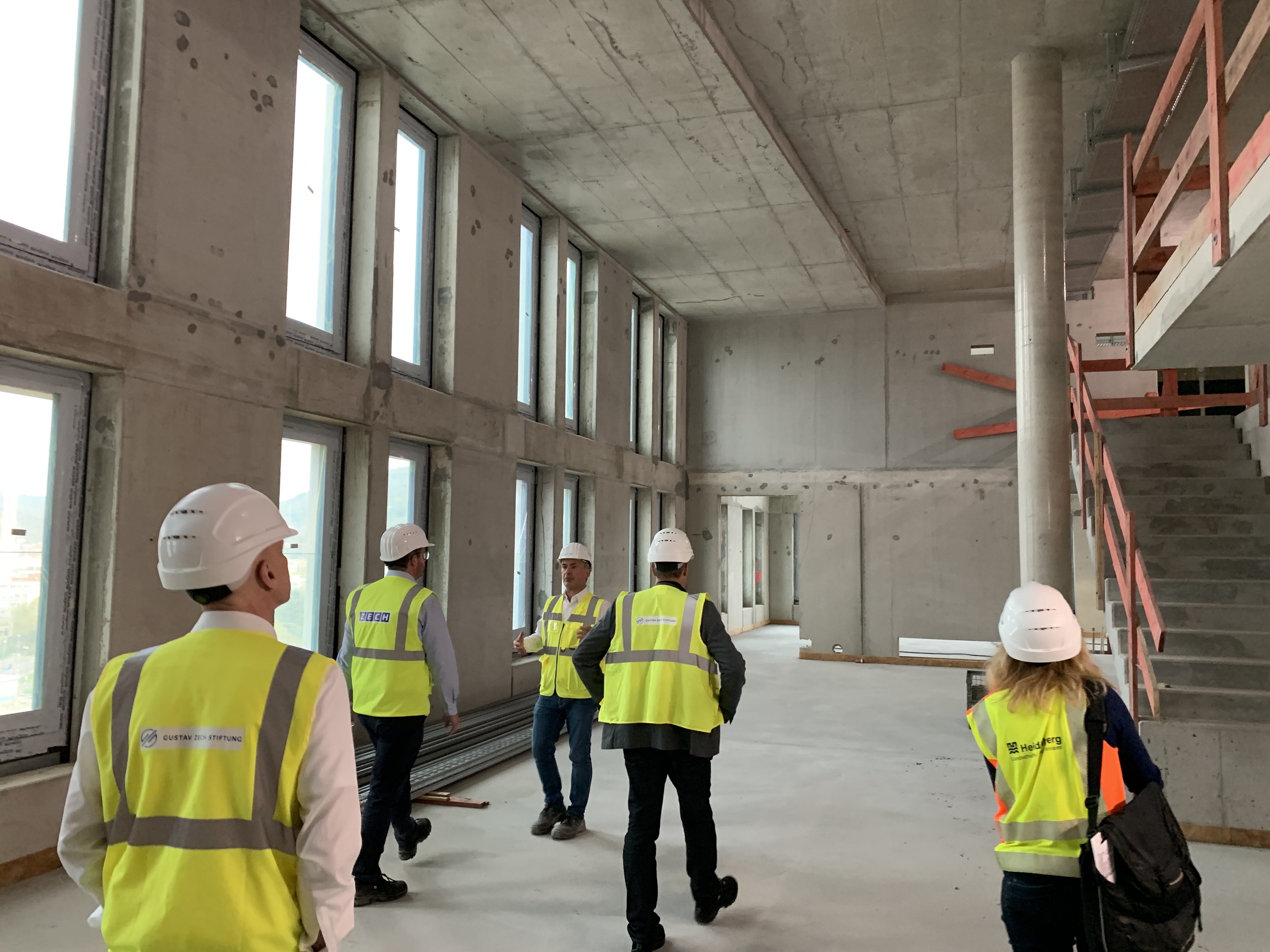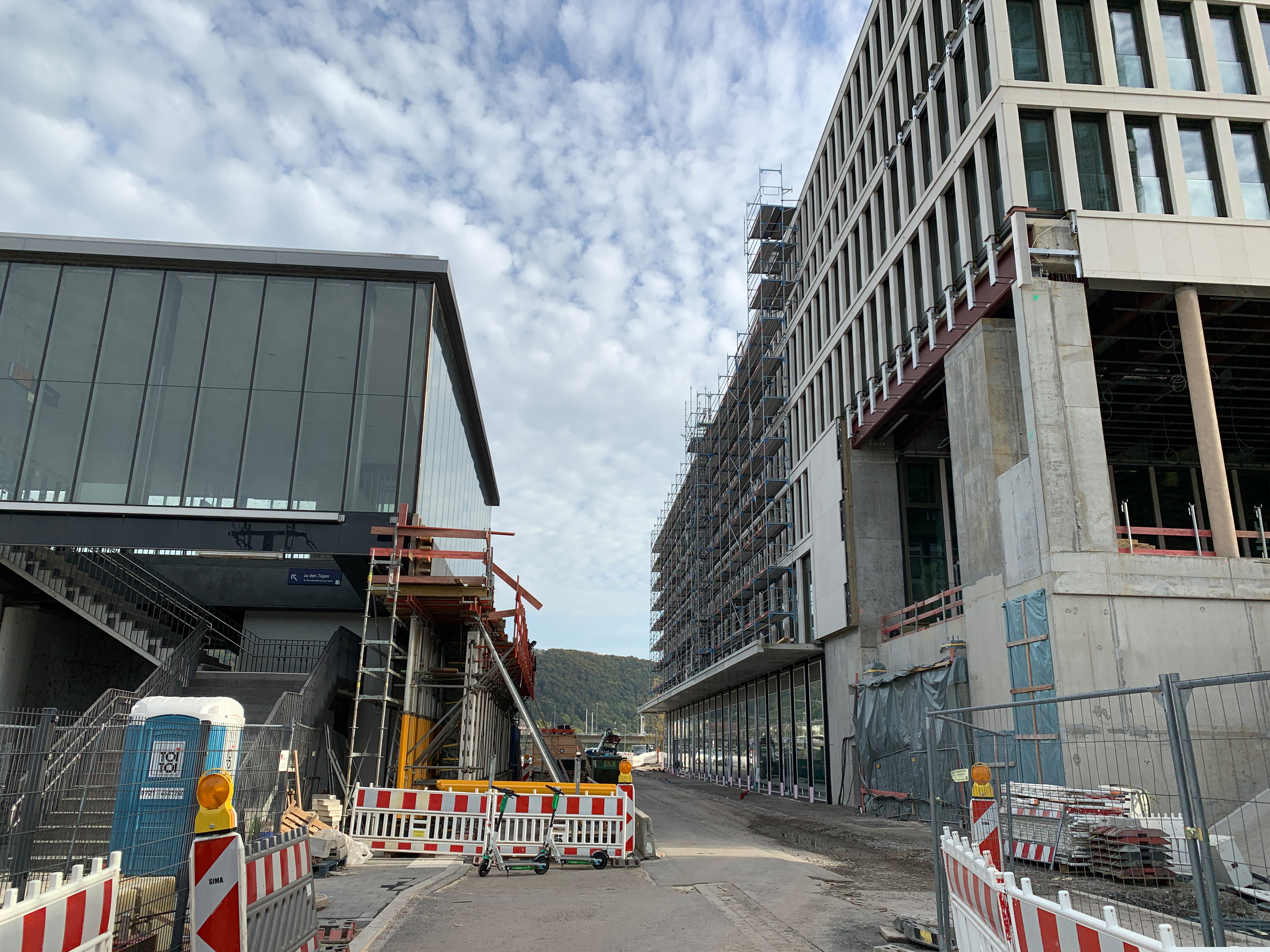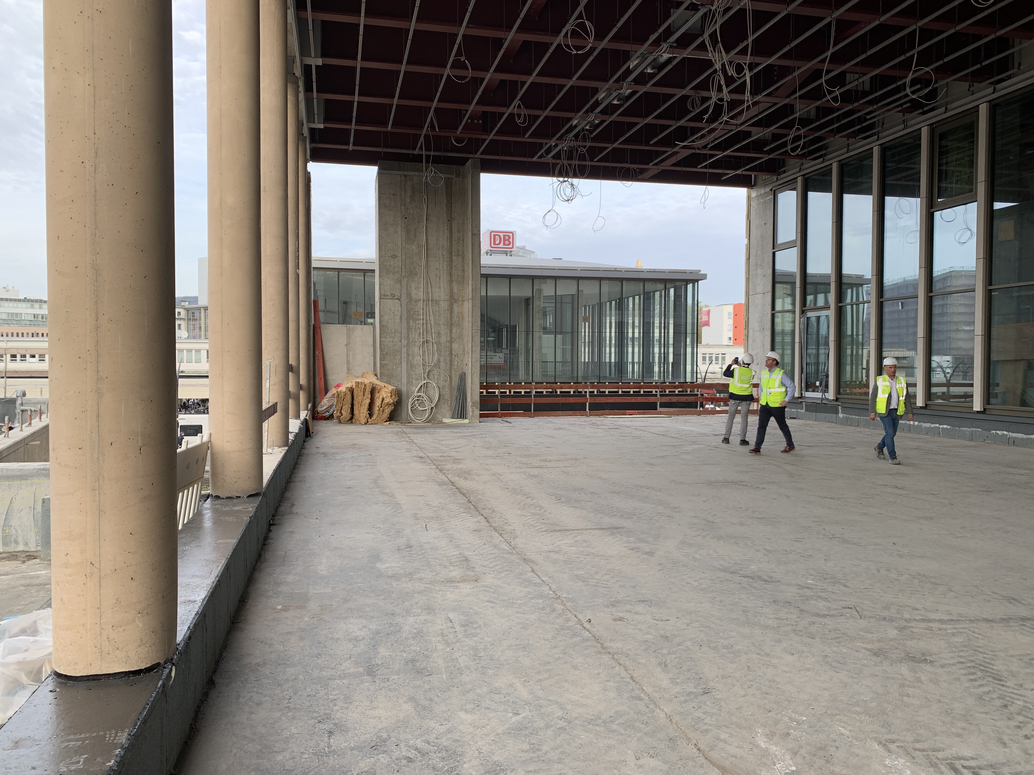 Auf der Baustelle sind rund 500 Beschäftigte an sechs Tagen pro Woche im Einsatz. Die Rohbauarbeiten sind abgeschlossen. Derzeit werden die Fassadenarbeiten, die technische Ausrüstung und der Innenausbau mit Hochdruck vorangetrieben. Ebenfalls haben die Arbeiten zur Ausführung der Außenanlagen begonnen.