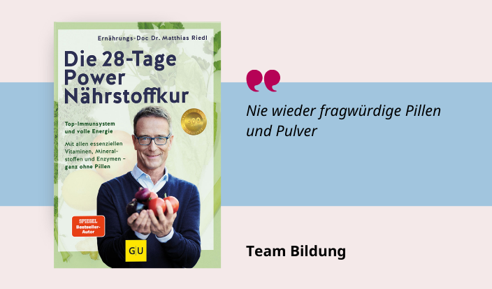 Fast die Hälfte aller Deutschen nehmen Nahrungsergänzungsmittel ein. Ernährungs-Doc Matthias Riedl ist jedoch der Meinung, dass diese auf keinen Fall eine gesunde Ernährung ersetzen und nur bei diagnostizierten Mangelerscheinungen sinnvoll sind. Mit einem Ernährungsplan für 28 Tage für drei nährstoffreiche tägliche Gerichte bietet er eine Rundumversorgung für ein ausgeglichenes Immunsystem und volle Energie. Seine mehr als 80 abwechslungsreichen Rezepte mit Nährstoffangaben sind für 2 Personen berechnet und basieren auf mehr Gemüse und gesundem Eiweiß, kombiniert mit Kohlehydraten aus Vollkorn und hochwertigen Pflanzenölen und etwas Obst.