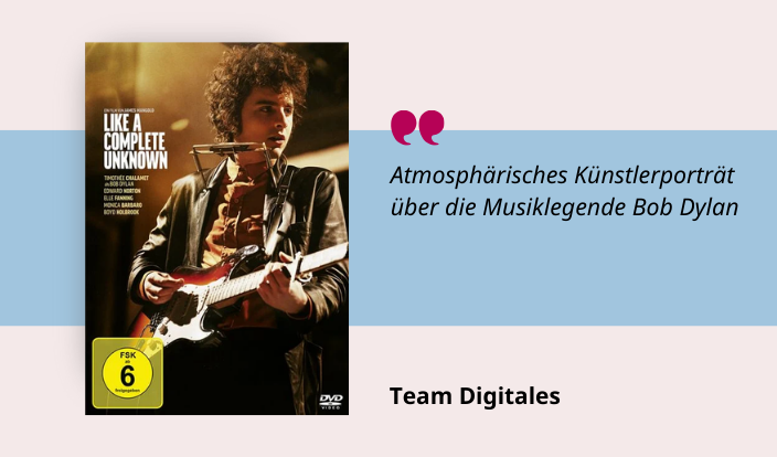 Ein komplett „Unbekannter“ taucht plötzlich in der Musiklandschaft der 60er Jahre in New York auf. Mit seinen tiefgründigen und ungekünstelten Folk-Songs begeistert er nicht nur die örtliche Musikszene.Dylan bewegt sich schließlich provokant von der Folkszene weg, um sich selbst neu zu erfinden und verändert damit auf seine Weise die Entwicklung der amerikanischen Folk- und Rockmusik. Wegbegleitende innige Freundschaften geht er dabei zu anderen Musikern wie Woody Guthrie und Joan Baez ein.Dune-Star Timothée Chalamet sieht Bob Dylan in dieser Zeitreise nicht nur zum Verwechseln ähnlich, sondern gibt den Charakter des Ausnahmemusikers überdurchschnittlich authentisch wieder.Absolut sehenswert und kurzweilig!