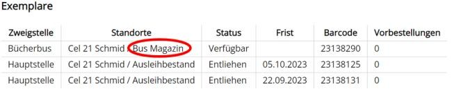 In dem Bus Magazin befinden sich über 20.000 Medien, die im Bücherbus keinen Platz haben. Wenn bei "Standorte" hinter dem Schrägstrich "/" "Bus Magazin" steht, können Sie sich die Titel über den Mitbring-Service in den Bücherbus bestellen.