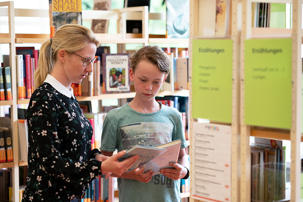 Auf allen Etagen des Hauses stehen kompetente und freundliche Ansprechpartner zu den Öffnungszeiten der Stadtbücherei zur Verfügung. Ergänzt wird das Angebot durch eine telefonische Beratung, die durchgängig erreichbar ist. Zudem steht der ReferateCoach Schülern zur Seite, die für Prüfungen, Referate oder Seminarkursarbeiten recherchieren. Für die Arbeit in den Schulen und Kindergärten stellt die Kinder- und Jugendbücherei auch individuelle Medienpakete zu verschiedenen Themen zusammen.